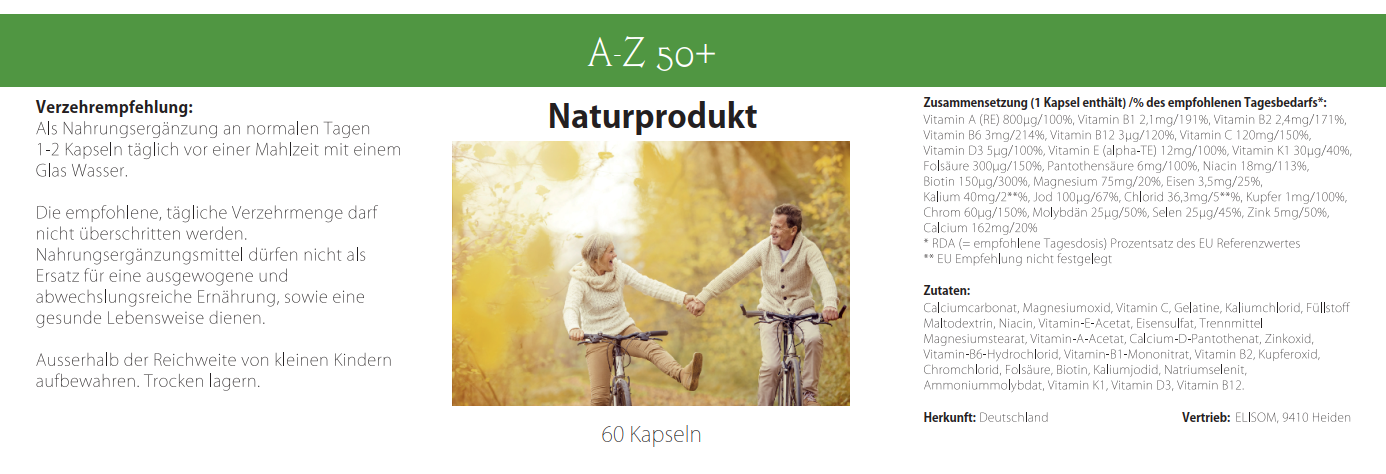 Mit zunehmendem Alter benötigt unser Körper immer weniger Kalorien, aber der Bedarf an Vitaminen, Mineralstoffen und Spurenelementen nimmt NICHT gleichermassen ab. Bei manchen Vitaminen und Mineralstoffen wird bei Menschen ab ca. 50 Jahren sogar eine höhere tägliche Zufuhr empfohlen. A-Z 50 plus berücksichtigt diesen veränderten Vitalstoffbedarf, so dass Sie eine gute Grundlage für den Erhalt Ihrer Gesundheit schaffen können, wenn Sie es täglich einnehmen.