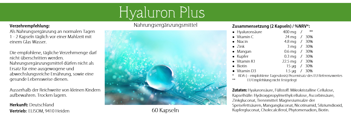 Innovativer, einzigartiger PLUSstoffkomplex mit dem Hauptbestandteil Hyaluronsäure. „Hyaluron Plus“ ist DAS natürliche Mittel für glatte schöne Haut und PLUSe Gelenke. Speziell entwickelt für Frauen und Männer ab 40 Jahren. Vergessen Sie „Hyaluronspritzen“ vom Schönheitschirurgen! Hyaluronkapseln wirken ohne Schmerzen, ohne Arzt, ohne Nebenwirkungen und sind dabei auch noch viel günstiger! Enthält zudem u.a. die Vitamine C und D, sowie für Haut und Gelenke wichtige Mineralien.