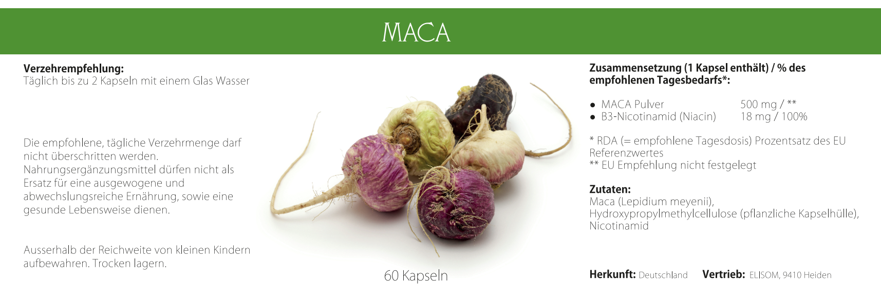 Maca (Lepidium meyenii), Hydroxypropylmethylcellulose (pflanzliche Kapselhülle), Nicotinamid.