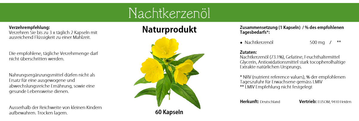Nachtkerzenöl (73,1 %), Gelatine, Feuchthaltemittel Glycerin, Antioxidationsmittel stark tocopherolhaltige Extrakte natürlichen Ursprungs.