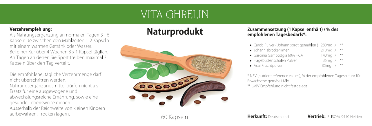 Die Zutaten von Vita Ghrelin sind sorgfältig ausgewählt und aufeinander abgestimmt, um Ihnen die bestmöglichen Ergebnisse zu bieten. Carob-Pulver, Johannisbrotkernmehl, Garcinia Gambodgia (mit 60% HCA), Hagebuttenschalen-Pulver und Acai-Fruchtpulver sind die Hauptbestandteile dieses Nahrungsergänzungsmittels.