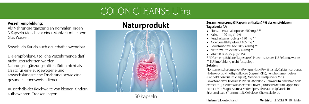 Fünf natürliche Vitalstoffe plus Kalzium und Vitamin D3 für Darm und Figur. Enthalten sind u.a Flohsamenschalen (für die Verdauung), Aloe Vera, Fenchelsamen, Löwenzahnkraut und Klettenwurzel. Alles völlig natürlich. Ein gesunder Darm ist Voraussetzung für die menschliche Gesundheit. Colon Cleanse Produkte werden immer wichtiger und beliebter, denn viele Menschen legen immer mehr Augenmerk auf die Darmgesundheit.