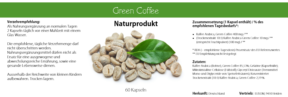 Kaffee Arabica (Bohne), Green Coffee 85,53%; Gelatine (Kapselhülle); Mikrokristalline Cellulose (Füllstoff); Glyceryl Distearate (Trennmittel Mono-und Diglyceride von Speisefettsäuren); Konzentrierter Trockenextrakt (10:1) Kaffee Arabica, Green Coffee 2,19 %.
