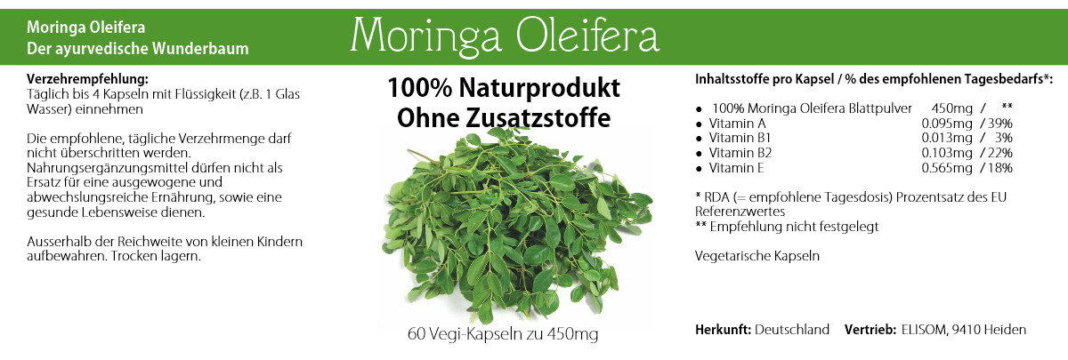 Moringa Oleifera Kapseln sind hochdosiert aus ~ 450mg frischer Blattmasse je Kapsel, ohne Zugabe von Füllstoffen, Zellulose udgl. Sie enthalten viele Vitamine, Mineralstoffe, Aminosäuren und andere natürliche Nährstoffe. Nähere Informationen zu den Nähr- und Wirkstoffen ersehen Sie unter "Inhaltsstoffe".